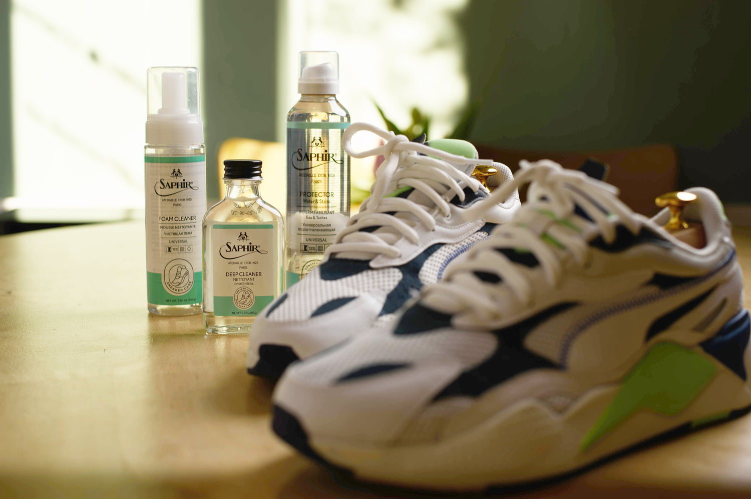 Thoroughly brush your shoes with a brush to remove any loose dirt and dust off the shoes. Begin by applying your favourite sneaker cleaner to your sneakers. We prefer Saphir Médaille d'Or Foam Cleaner since it is ready to use. Use a brush and/or cloth to distribute the cleaner over your sneakers. We like to use a mildly moist brush with a longer handle to clean the upper of our synthetic sneakers and a cloth for the soles. Afterwards, rinse off the sneaker cleaner with water. Make sure that you rinse off all the cleaner before setting your sneakers away to dry. Do not place your sneakers on a heat source such as a radiator since this can cause the material of your sneakers to dry out. Your sneakers should look quite a lot better after this first step. If not please feel free to repeat this step again.